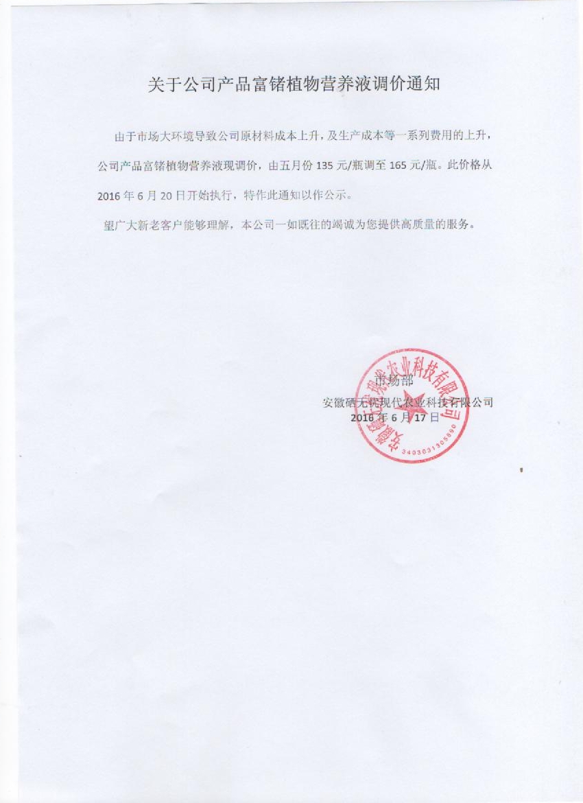 關(guān)于公司產(chǎn)品富鍺植物營養(yǎng)液調(diào)價通知